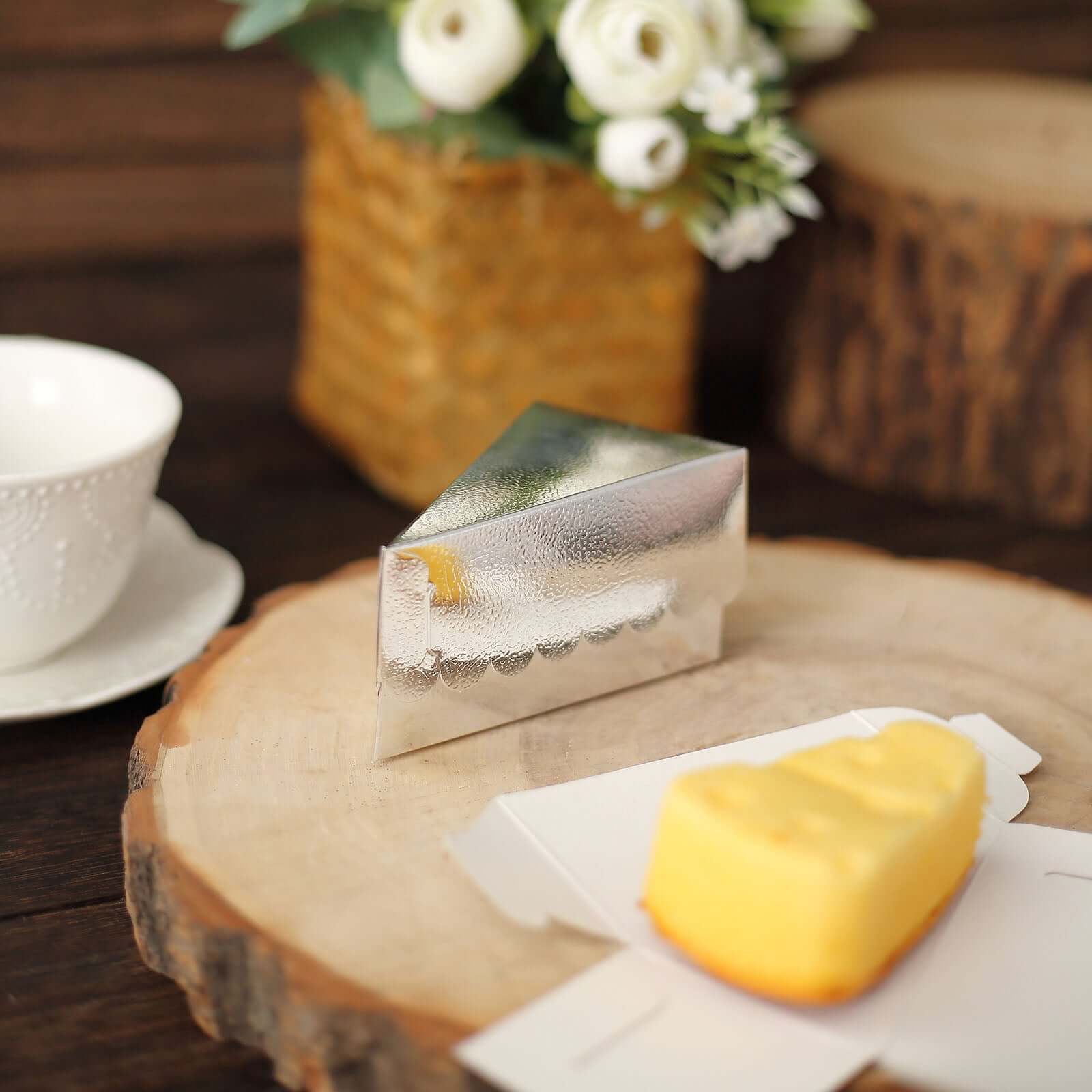 10-Pack Cardstock Triangle Cake Slice Boxes Silver with Scalloped Top 4"x2.5"