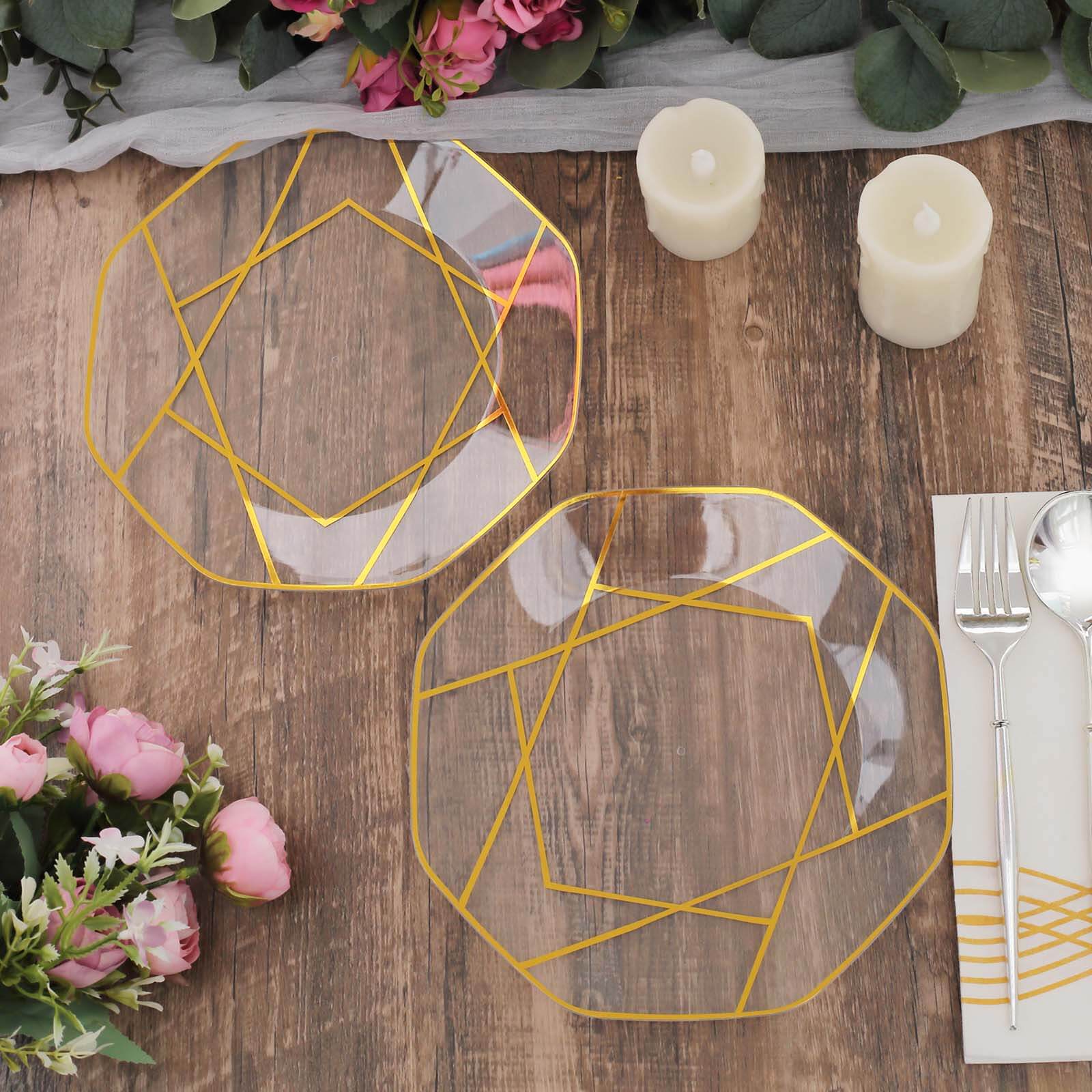 10-Pack Plastic 8" Octagon Dessert Plates in Clear - Modern Disposable Salad/Appetizer Plates with Gold Geometric Design for Special Occasions & Celebrations
