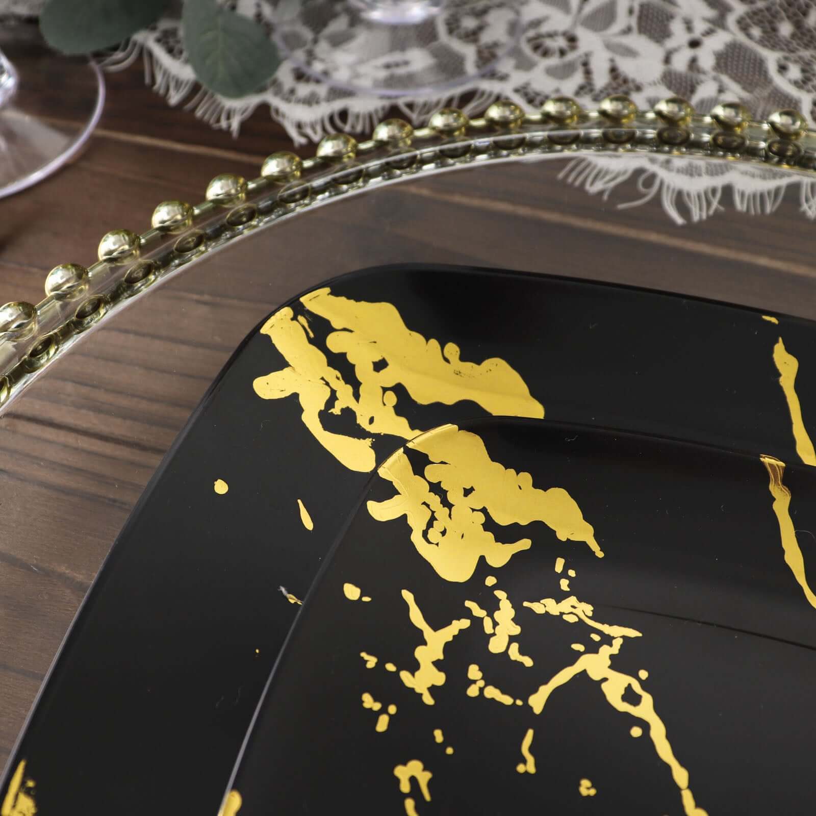 10-Pack Plastic 8" Square Dessert Plates in Black with Gold Marble Design - Disposable Appetizer Salad Party Plates