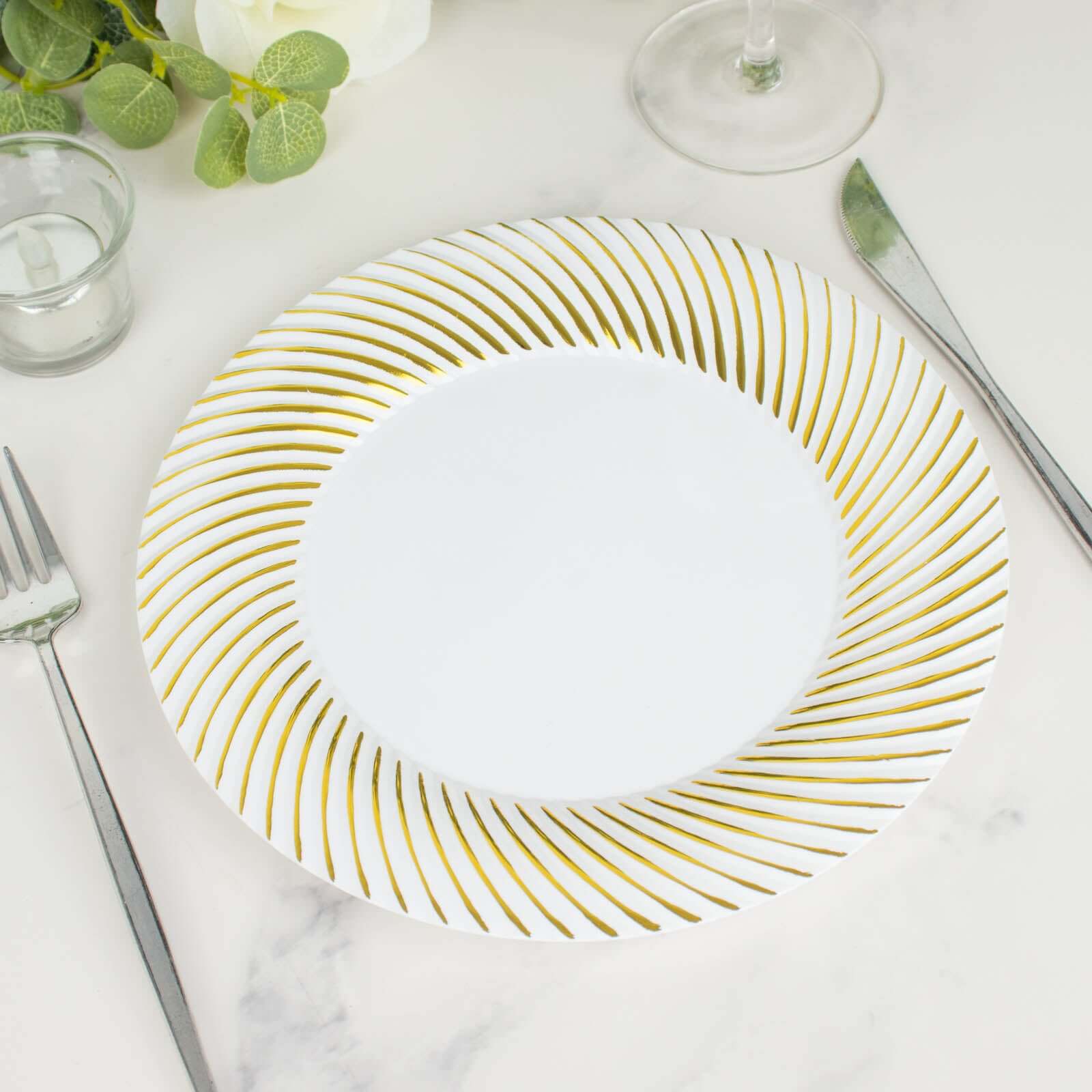 10-Pack Plastic 9" Round Dinner Plates White with Gold Swirl Rim - Disposable Party Plates