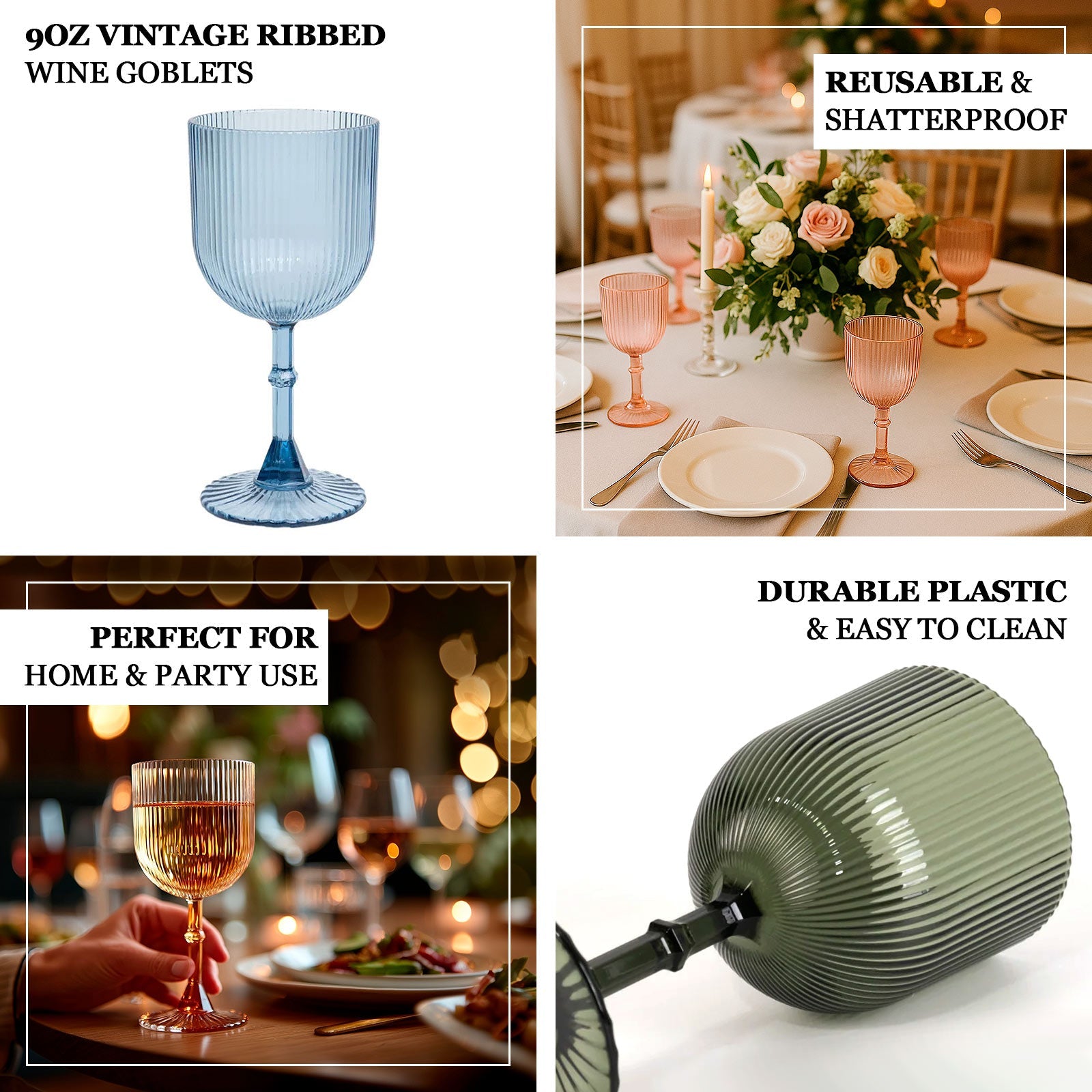 12-Pack Plastic Goblets Hunter Emerald Green Vintage Ribbed Pattern - Reusable Shatterproof Glassware 9oz