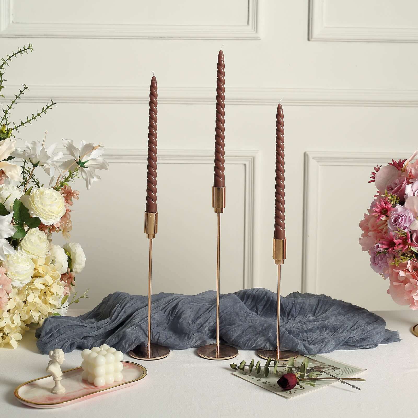 12-Pack Taper Candles Spiral Long Burn Wick Design Mocha Brown - Premium Unscented Wax Dinner Candle Sticks 11"