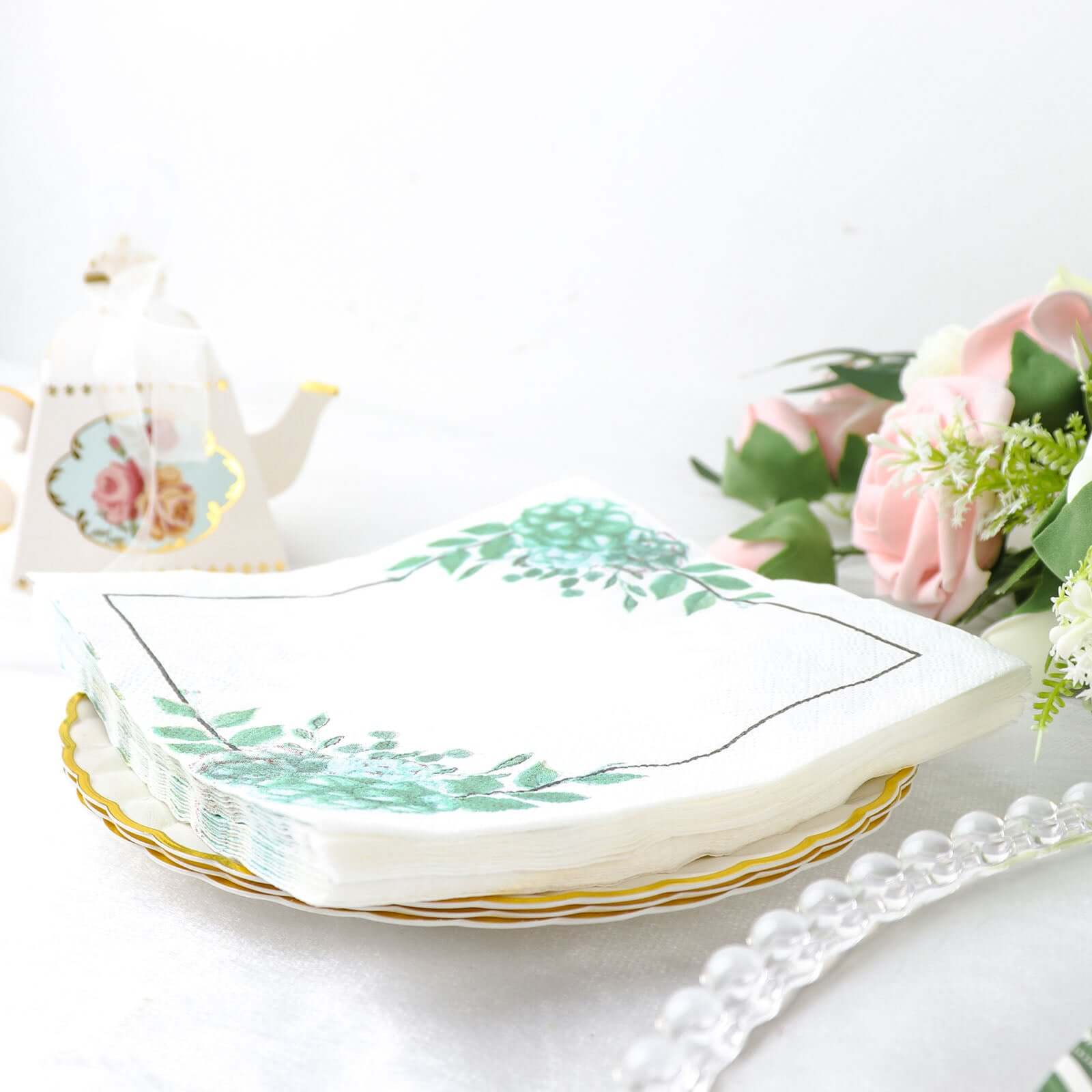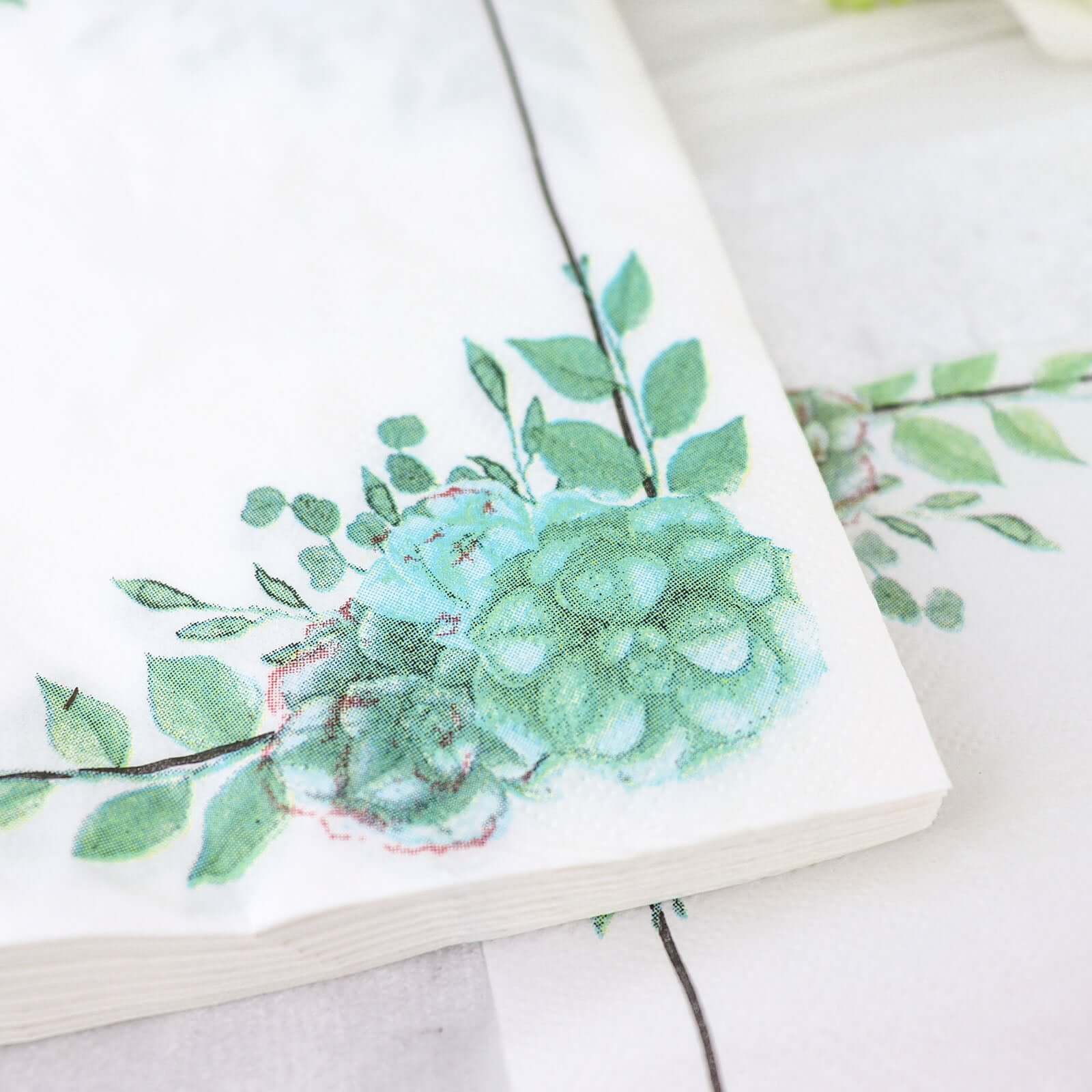 20-Pack Paper Dinner Napkins with Floral Design White/Green - Disposable 2 Ply Beverage Napkins 6.5"x6.5"