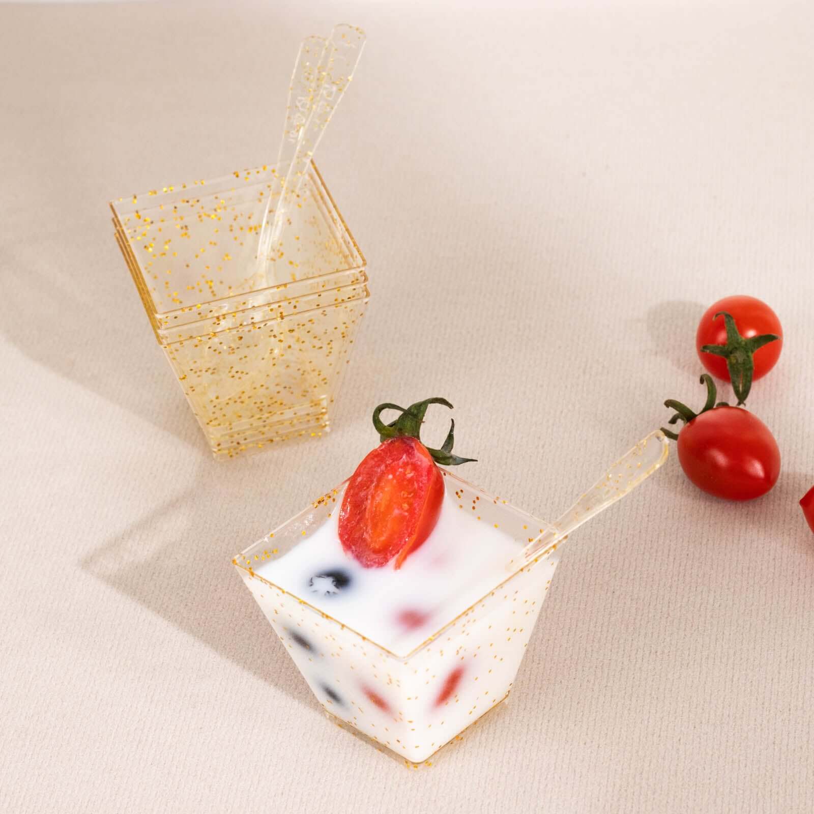 24-Pack Plastic Square Dessert Cups Clear with Gold Glitters - Disposable Snack Serving Bowls and Spoon Set for Parties, Events & Banquets 2oz