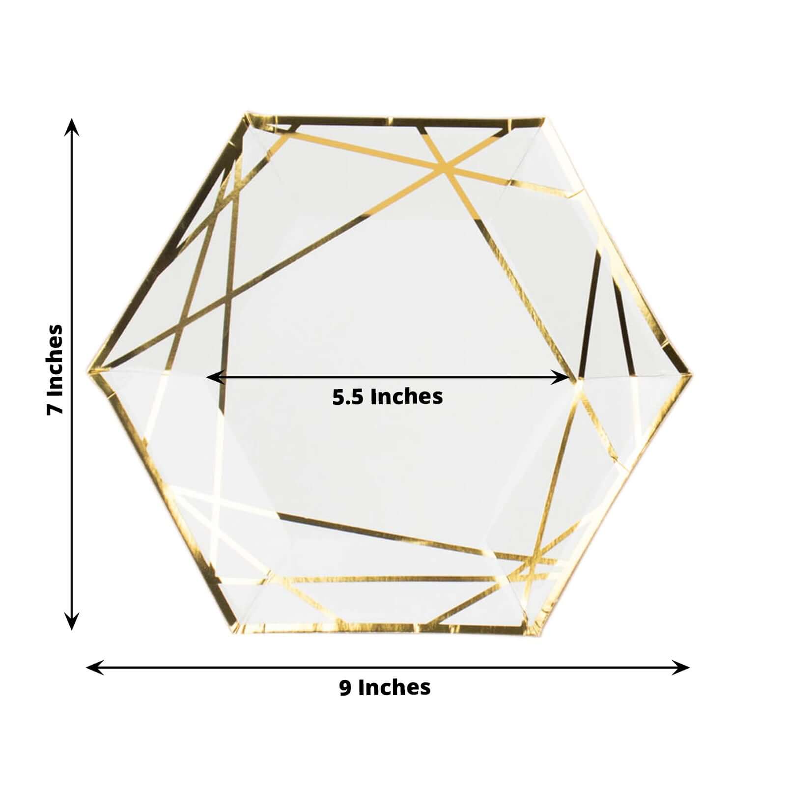 25-Pack Paper 7" Hexagon Dessert Plates in White with Gold Geometric Lines & Rim - Stylish Disposable Geometric 300GSM Appetizer Salad Plates for Events & Banquets