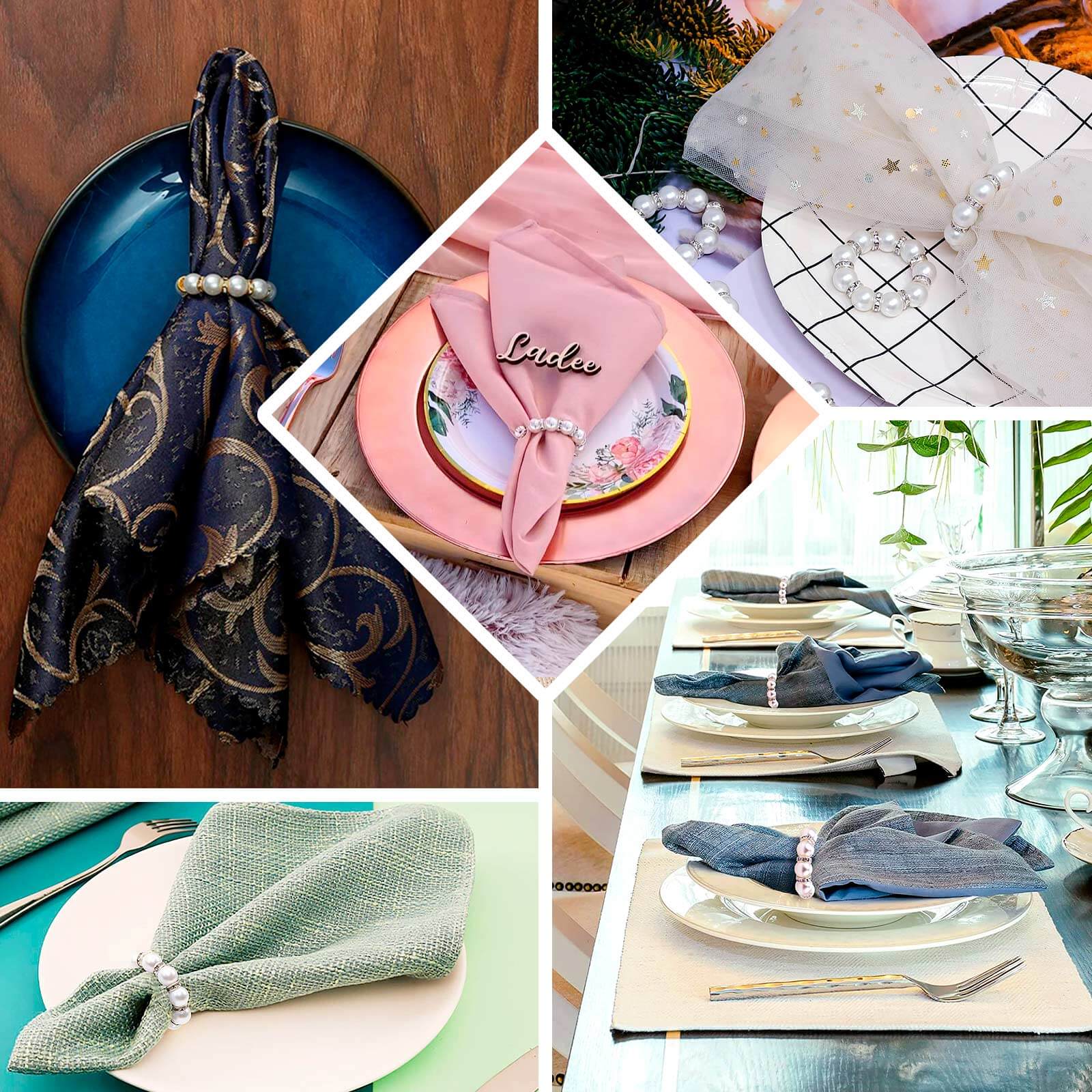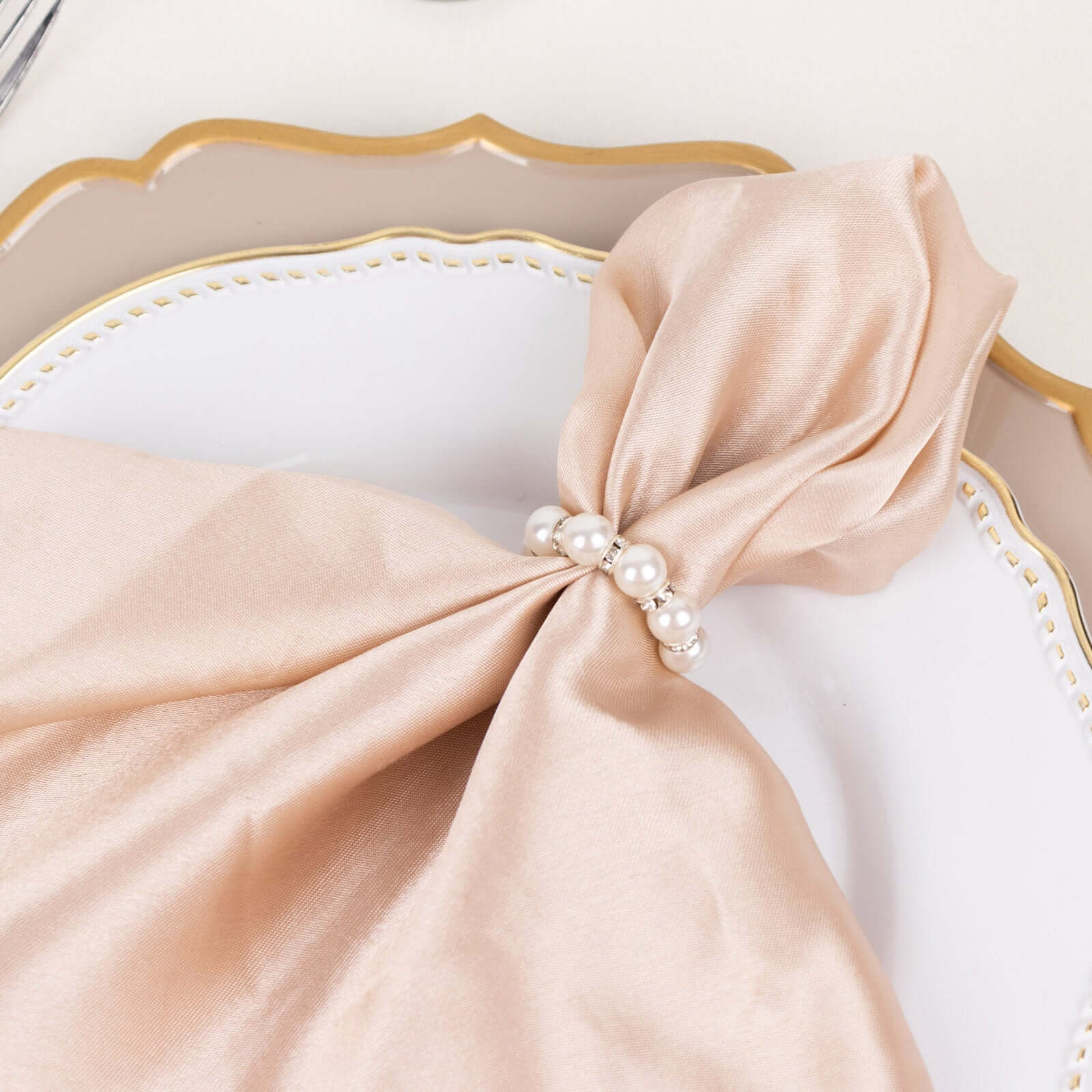 4 Pack 1.5" White Pearl Beads and Silver Rhinestone Napkin Rings, Elegant Round Serviette Buckle Napkin Holders