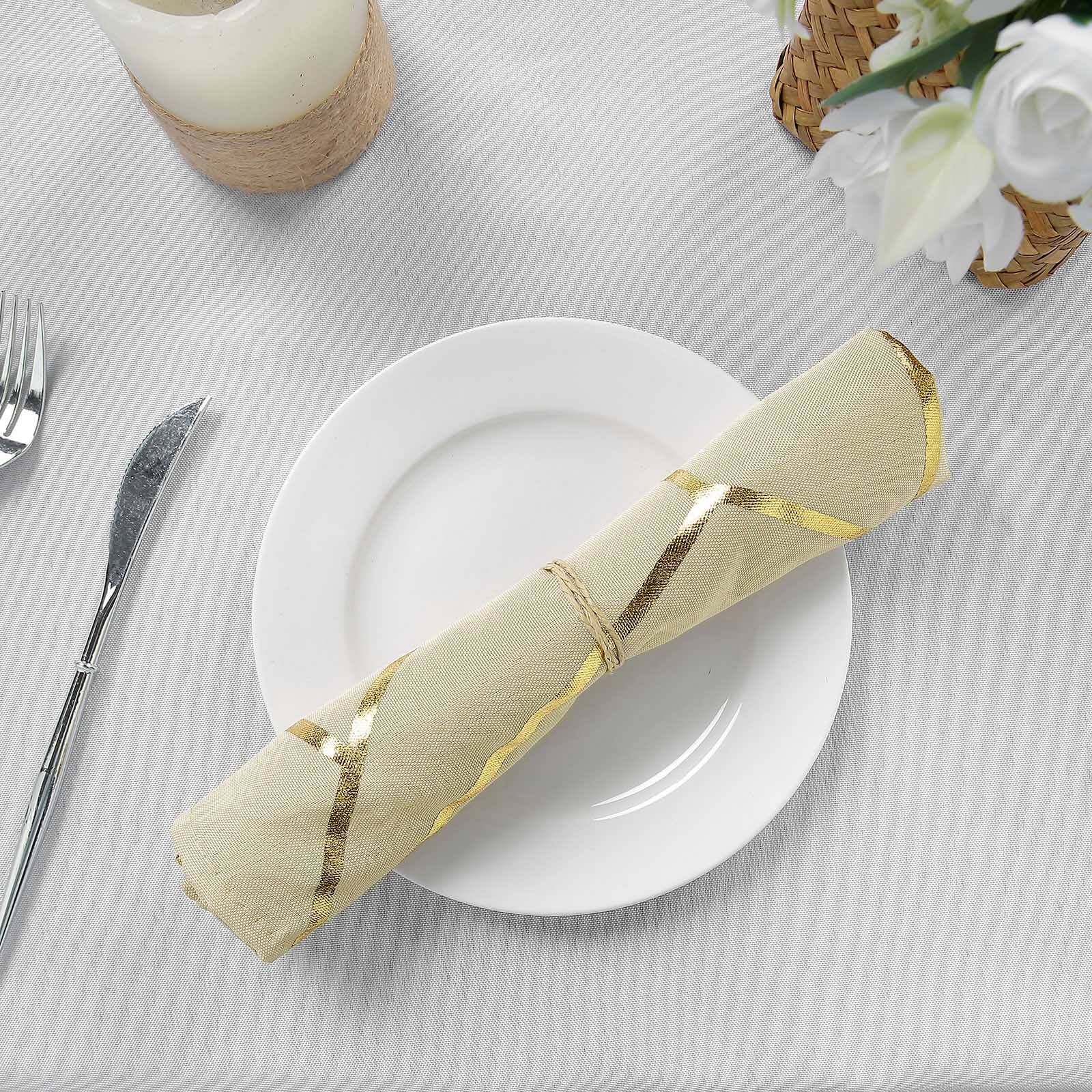5 Pack Polyester 20"x20" Napkins Beige with Gold Geometric Foil Pattern - Modern Reusable Dinner Napkins