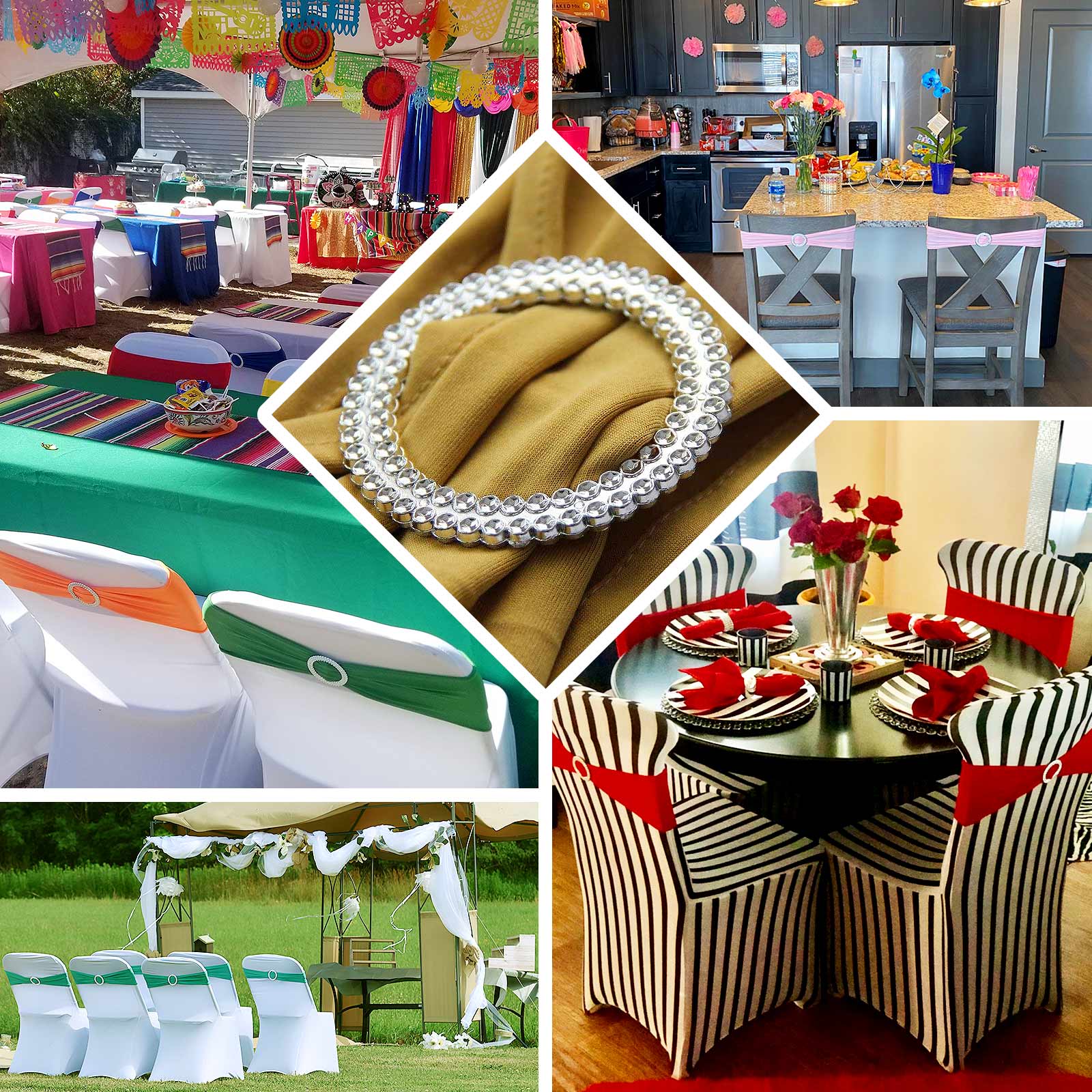 - Uses:Â Add Glamour and Charm to your Chairs in any Events, Hotels, Restaurants, Wedding, Party, Event, Banquet, Decoration. Also used to tie the Cocktail Tablecloth, Drapes and Gift Bows.