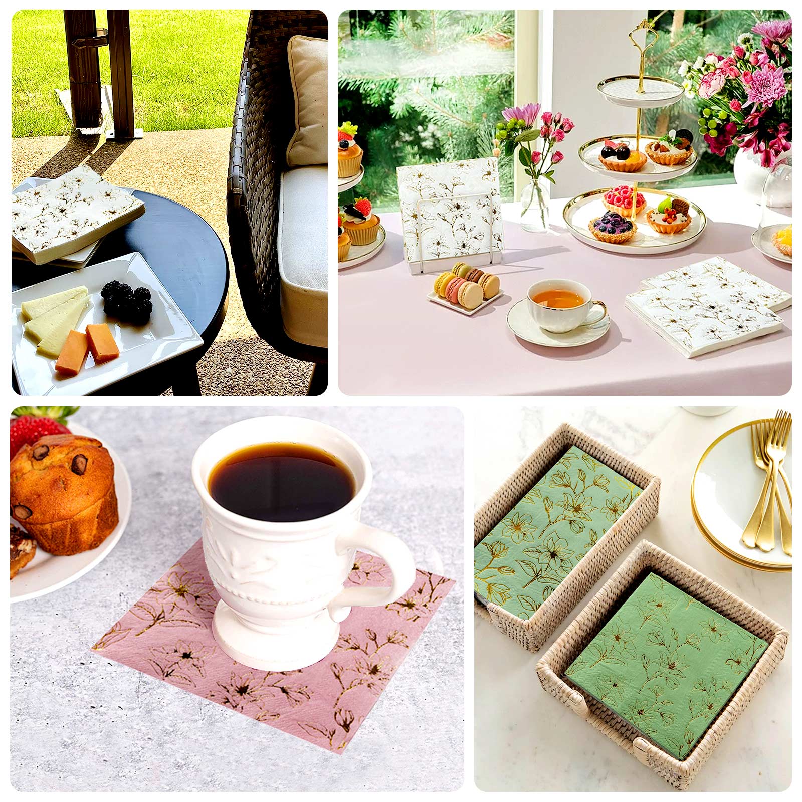 50-Pack Paper Cocktail Napkins with Gold Magnolia Flowers Print Dusty Sage Green - Highly 2 Ply Absorbent Soft Napkins for Beverages