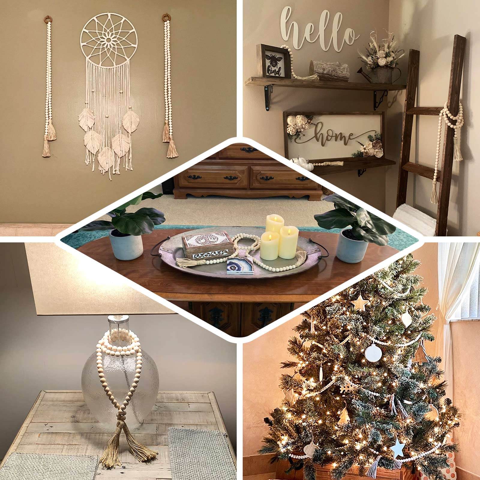 55" Cream Rustic Boho Chic Wood Bead Garland With Tassels, Farmhouse Country Wood Bead Chain