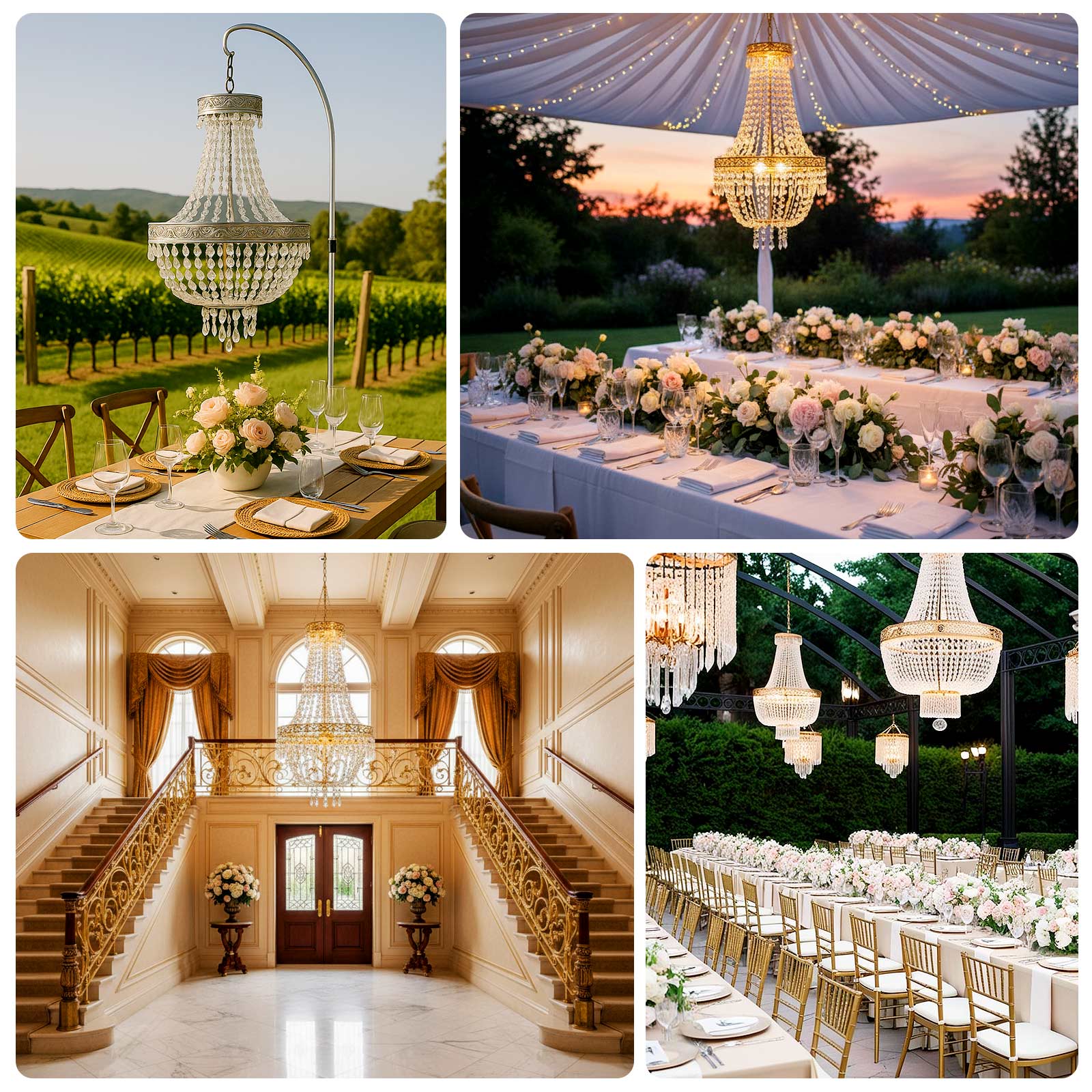 - Uses: Home Decor, Luxury Weddings, Galas, Banquets, Hotel Lobbies, Ballrooms, Restaurants, Bars etc.