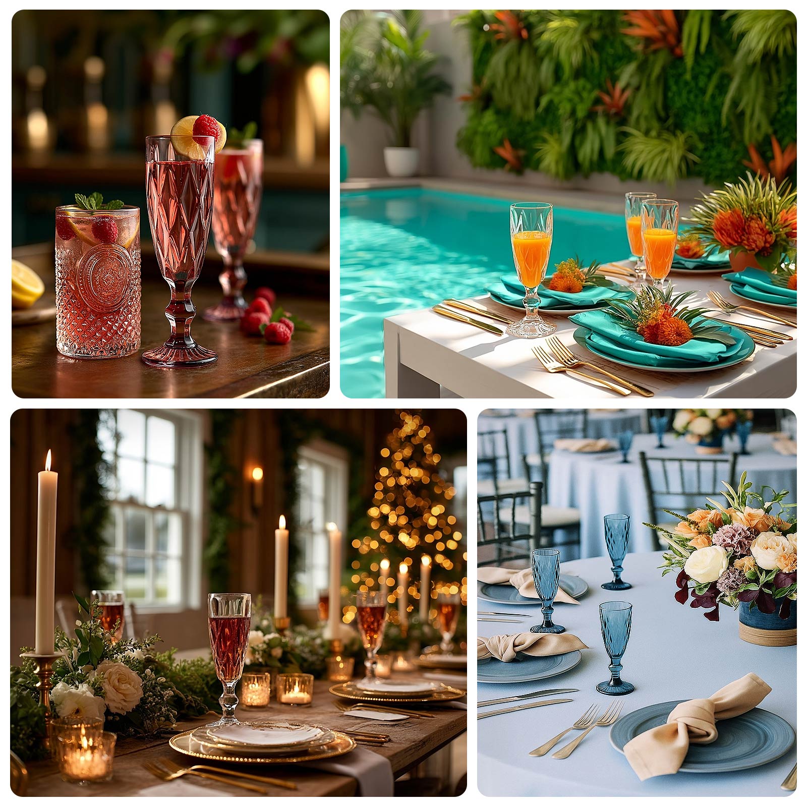 6-Pack Champagne Flute Glasses Transparent Ocean Blue Textured Crystal Cut Design - Chic Wine Goblets for Parties & Events 6oz 8"