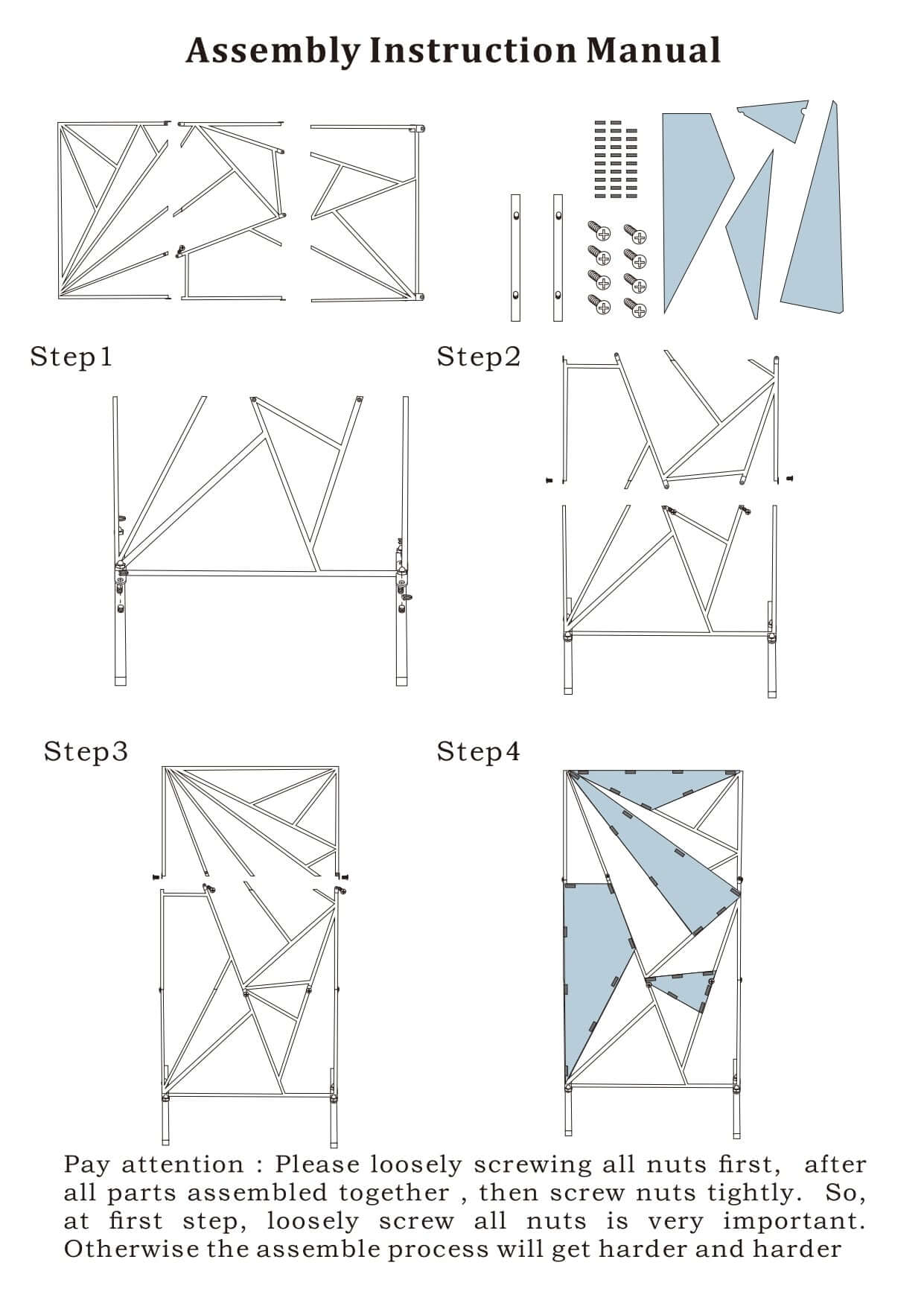 - Installation Tips:Â Loosely screw all nuts first. After all parts are assembled, then screw the nuts tightly.