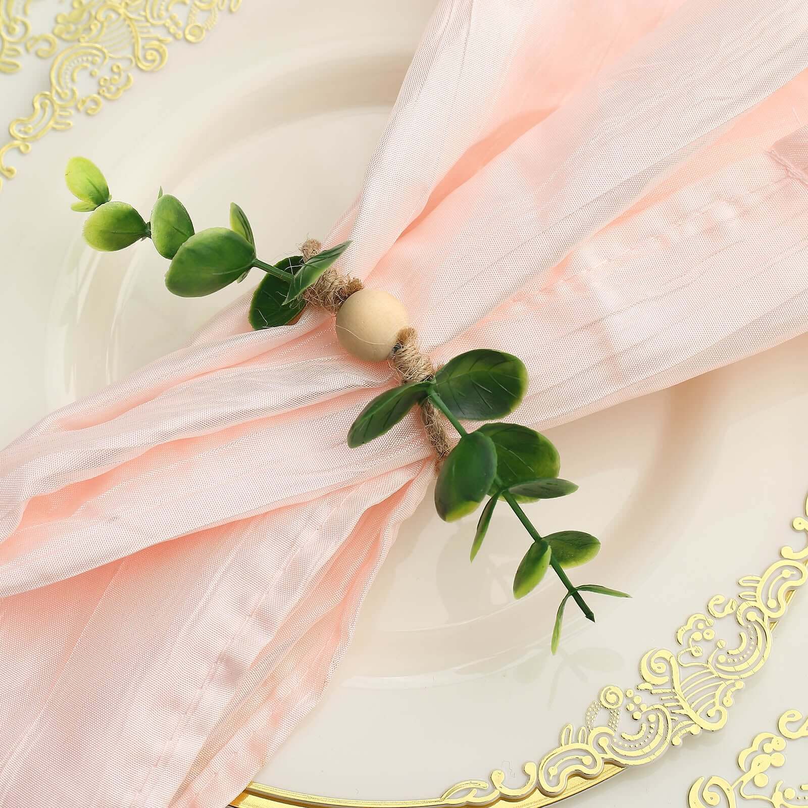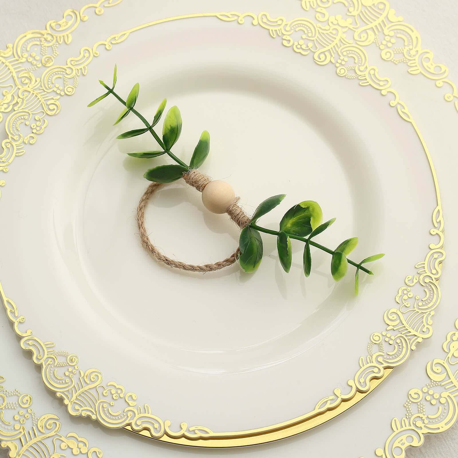 8 Pack Rustic Green Eucalyptus Leaf Wooden Beaded Jute Napkin Rings, Handmade Farmhouse Burlap Napkin Serviette Buckle Holders
