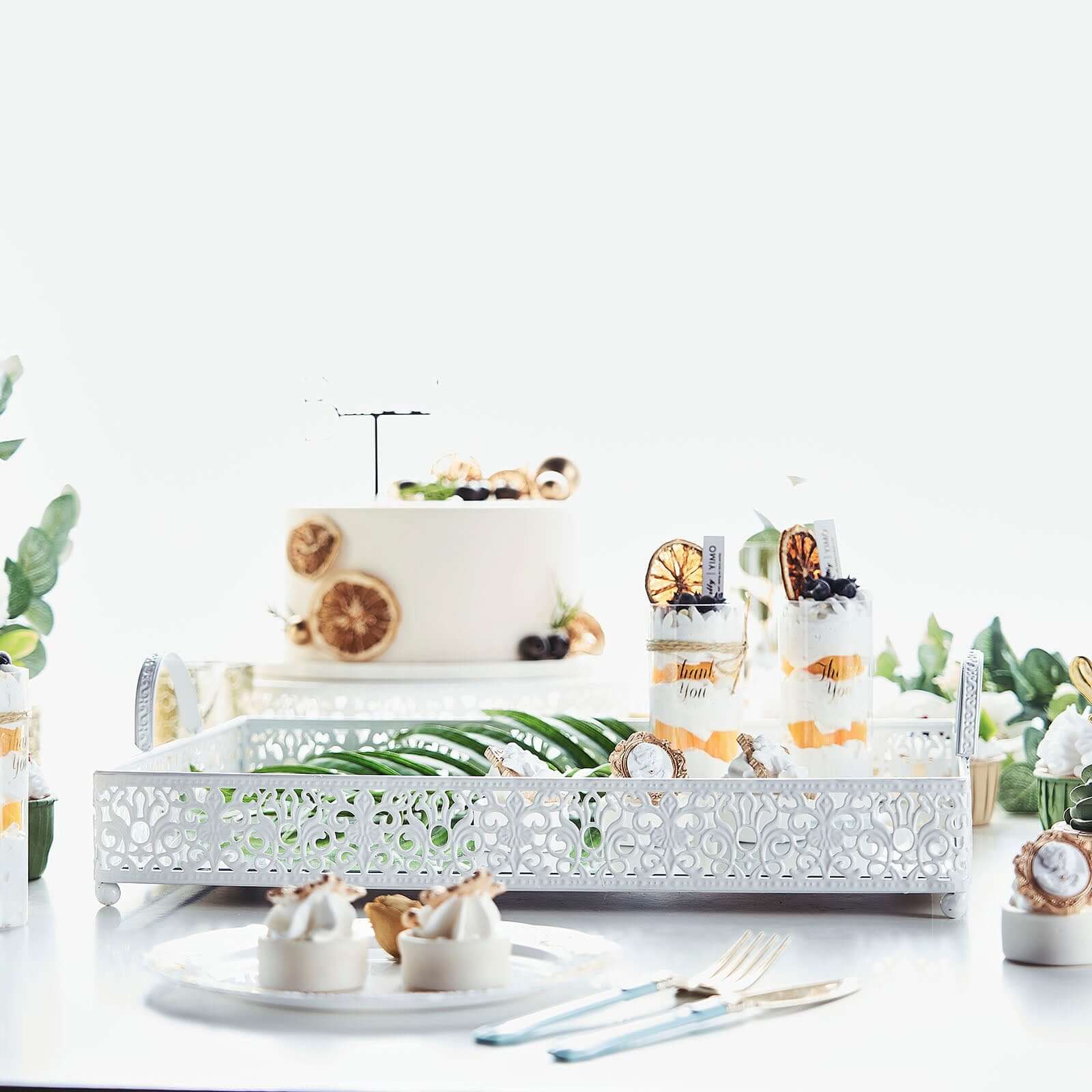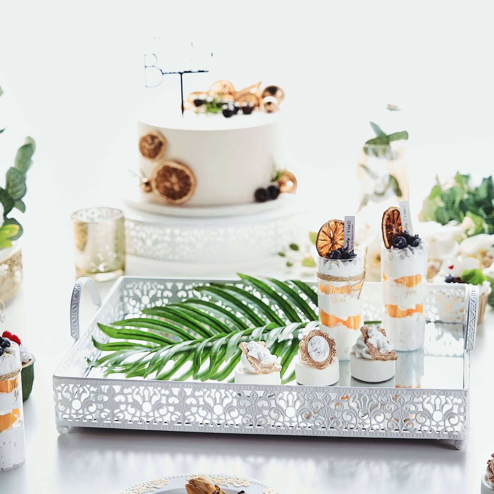 Metal Mirrored Rectangle Serving Tray 16"x12" in White Fleur De Lis Design with Handles, French Inspired Decorative Vanity Tray Centerpiece