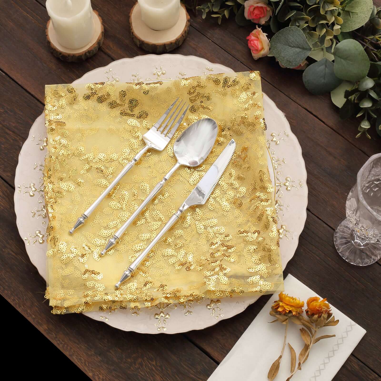 Sequin Tulle 20"x20" Napkin Gold Embroidered Leaf Vine Pattern - Shimmering Event Decor