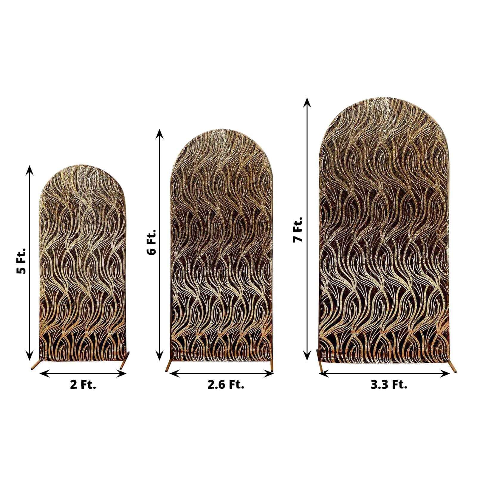 Set of 3 Black Wave Mesh Chiara Wedding Arch Covers With Gold Embroidered Sequins, Fitted Covers For Round Top Backdrop Stands - 5ft,6ft,7ft