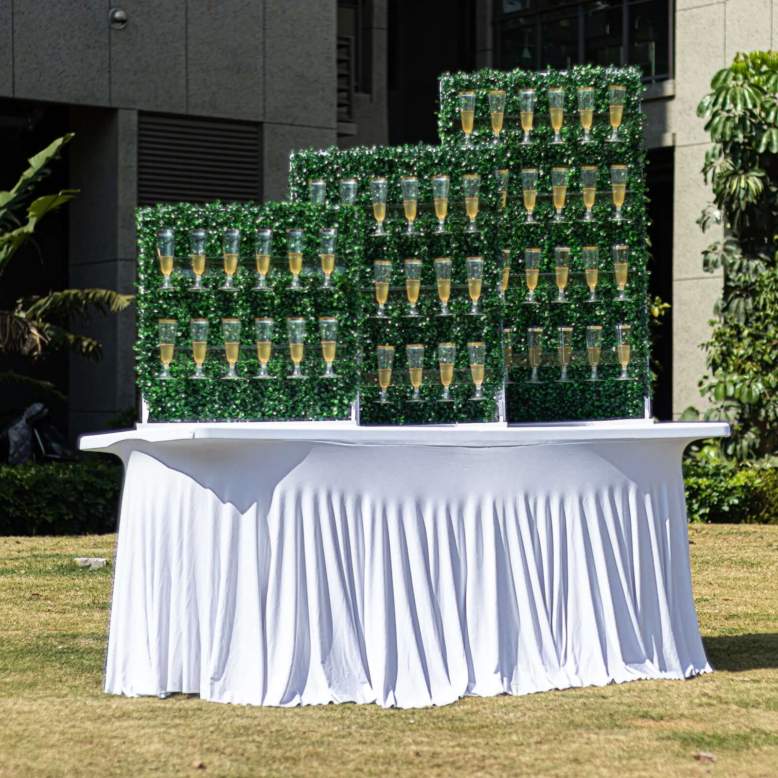 Set of 3 Champagne Wall Glass Holder Green - Tiered Faux Boxwood Stemware Rack Cocktail Display Drink Organizer for Classy Events & Banquets 24", 33", 42"