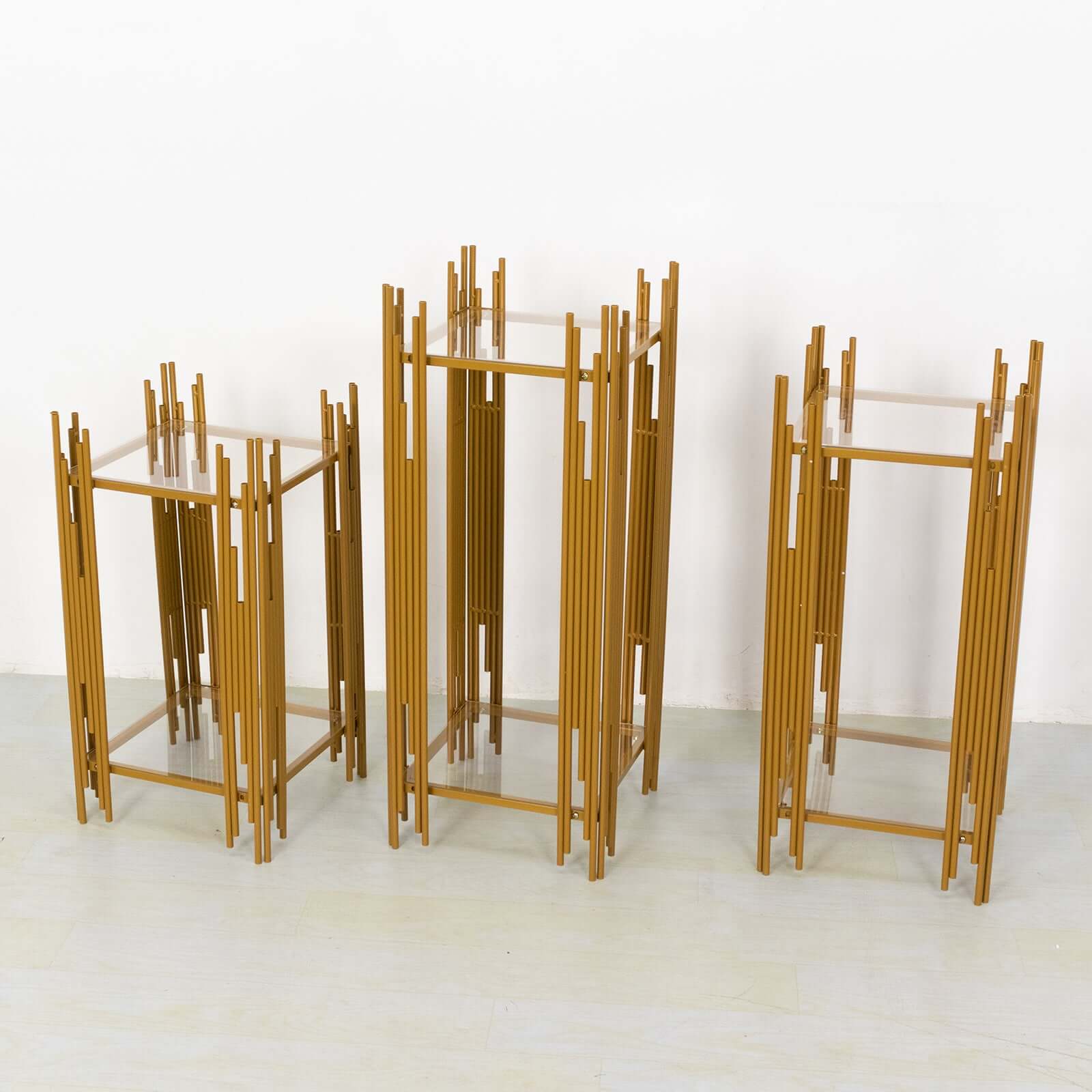 Set of 3 Wedding Pedestal Stands Square Acrylic Plate Design Gold - Metal Flower Display Plinths 26",30",34"