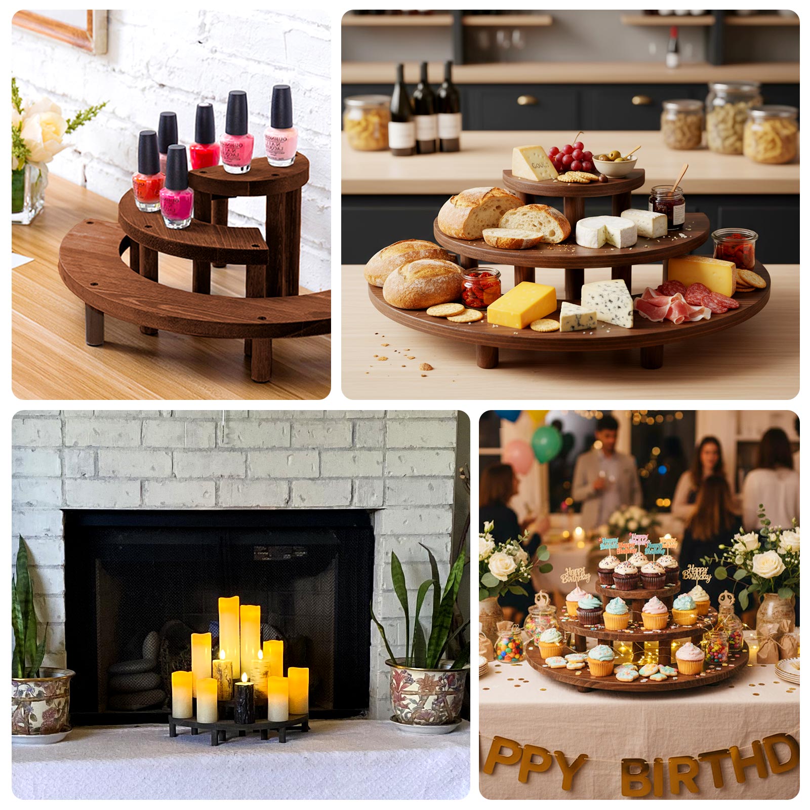 Set of 3 Wooden Dessert Pedestals Rustic Brown 3-Tier Semicircle Design - Half Moon Cupcake Display Risers 7", 13", 18"
