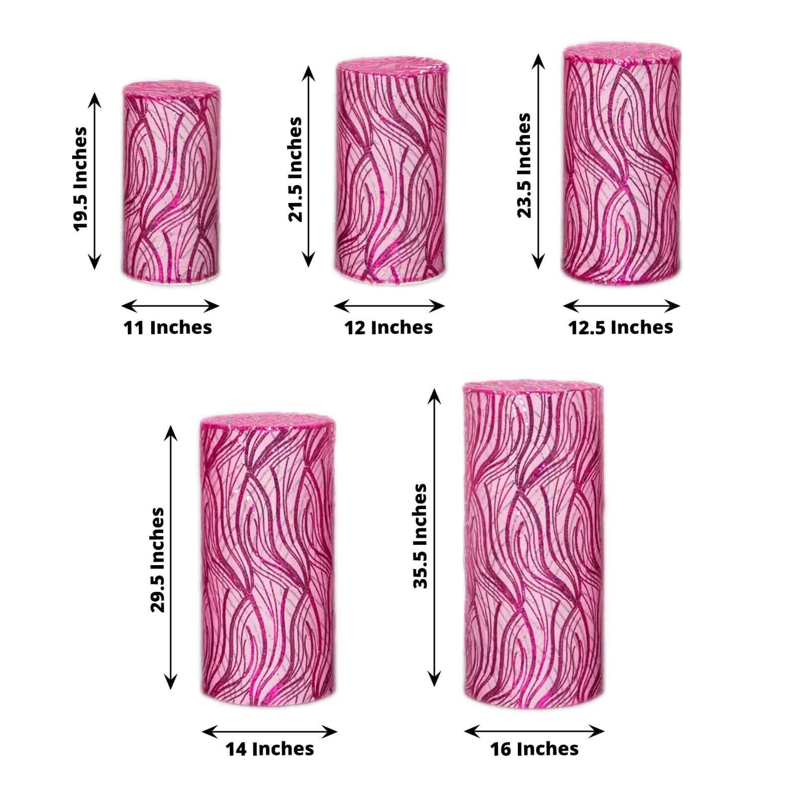 Set of 5 Fuchsia Wave Mesh Cylinder Pedestal Stand Covers with Embroidered Sequins, Pillar Prop Covers - 160 GSM
