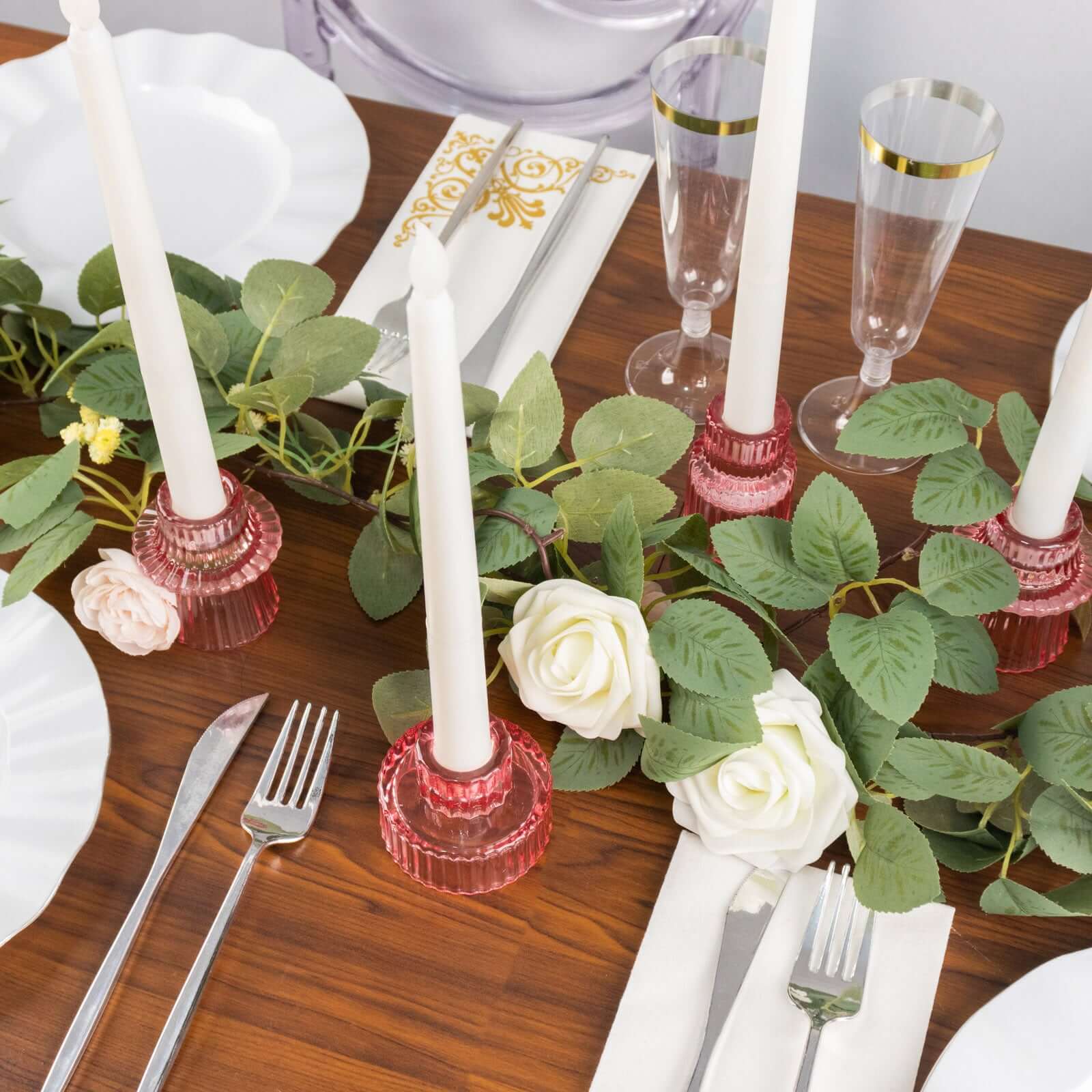 Set of 6 Glass Taper Candle Holders Ribbed Crystal Design Pink - Reversible Mini Votive Tealight Stands 3"