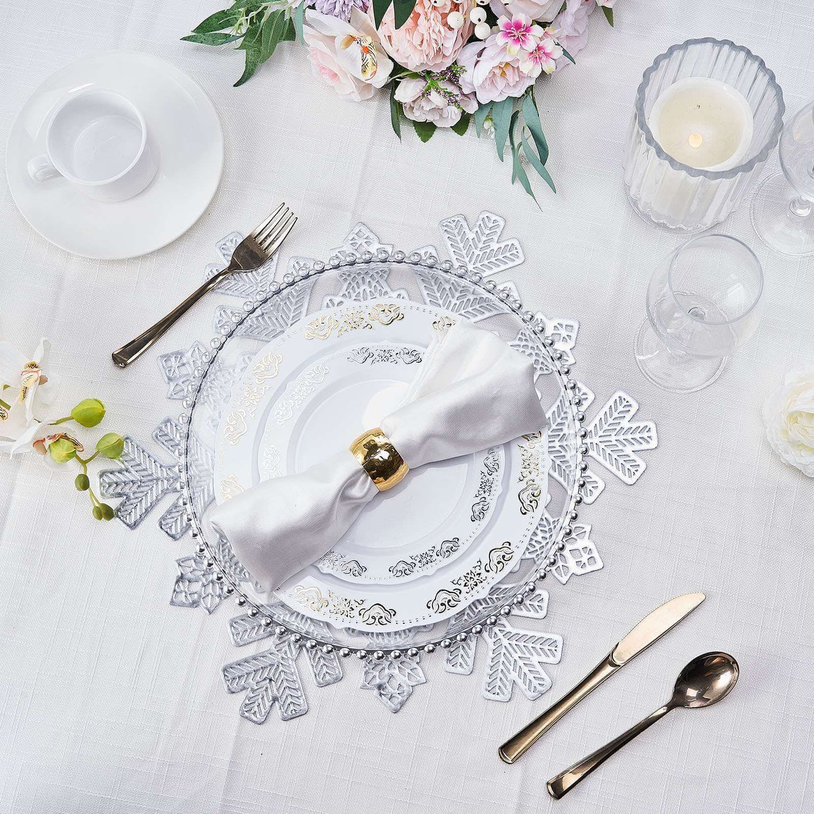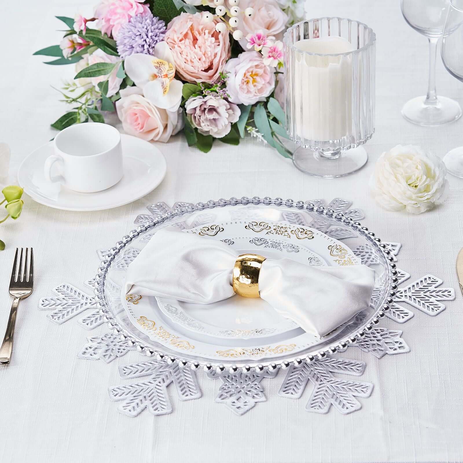 6-Pack Dining Table Mats Snowflake Design Silver - Vinyl Non-Slip Surface for Winter Decor 18"